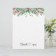 Winter Greenery Dank u wel. Dit ontwerp is voorzien van een afbeelding van dennenappels en groenbladeringen met rode bessen op witte achtergrond. De tekst "Dank u"wordt geschreven in een kalligrafiestijl. Pas uw eigen tekst aan.