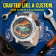 This bold watch face features a vintage-style green hot rod car, its lower half surrounded by intense orange and red flames, appearing to race on a dark road. The background includes dark, stormy-looking clouds that blend with the fiery hues, creating a dramatic and powerful scene for automotive enthusiasts.