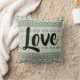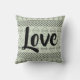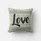 Stomme en trendy gooien kussen. Aztec geometrisch zuidwestpatroon met het woord Liefde in manuscript. Zwart afdrukken op groene achtergrond.