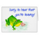 Une petite grenouille verte mignonne essuie ses larmes avec un mouchoir rouge et par blanc repéré parce qu'il est regrettable que vous partiez ; d'une illustration pour aquarelle par Judy Adamson. L'intérieur est laissé vide pour votre propre message et d'autres cartes et cadeaux avec des grenouilles sont disponibles dans mon magasin.