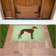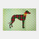 Red and green plaid greyhound silhouette with ribbon against a holly background.