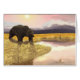Un ours grizzli s'approche d'un étang tandis que le soleil descend au-dessus de montagnes lointaines.