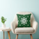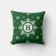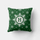 Aangepaste sneeuwvlokkussens in kerstgroen. Gepersonaliseerde Feestdagen kussen met witte sneeuwvlokken. Grote sneeuwvlokken in het midden van het kussen waar je je initiaal kunt toevoegen. Unieke kussen voor kerst-home decor - op maat van uw monogram.