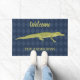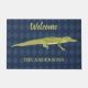Creëer Een wilde welkomstmat die perfect is voor Gator Country. Deze deurmat heeft een realistische stijlillustratie van een alligator in een olijfgroene kleur tegen een marineblauwe achtergrond en is klaar om te worden gepersonaliseerd met een naam in bijpassende olijfgroene belettering. U kunt de scriptkop bovenaan ook aanpassen.