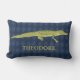 Creëer een gepersonaliseerd cadeau dat perfect is voor iemand die van alligators en andere dieren houdt. Deze gooikussens of -kussen hebben een realistische stijlillustratie van een alligator in een groene kleur voor olijven, geplaatst tegen een blauw gepatterde achtergrond van de marine en zijn klaar om gepersonaliseerd te worden met een naam in overeenkomende groene letters voor olijven.