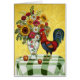 Een rooster op een groene controletafel met een florale vaas met daarin een zakje.
