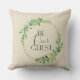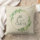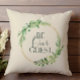 Sierkussen met zachte crèmekleurige achtergrond, elegante groene en gouden krans met de woorden 'Be Our Guest' op de voorzijde, bijpassende achterzijde. Bekijk onze complete collectie decoraties in onze Zazzle winkel!