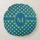 Een zeer stijlvolle ronde piloot of kussen om je te personaliseren met een monogram of Initialen. Het patroon van groene, witte en gele polka stippen op een diepe blauwe achtergrond (die u kunt veranderen als u dit wenst) komt uit het collectie "Marigold Medley" van Posh & Painterly en past alle kussens aan.