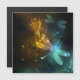 Vlucht van gloeiende, groene, artistiek getekende libel met doorzichtige groene en gele vleugels op gloeiende nachtachtergrond met moerasplanten en vuurvliegjes. Lichtgevende libel.