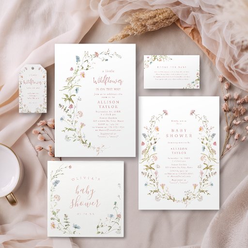 Elegante delicate waterverf wilde bloem krans omlijst uw evenementdetails. Pastel paletten van zacht geel, off wit, beige, stoffig roze, blozend roze, bordeauxrood en botanisch groen, eenvoudig en romantisch. Geweldige kleine wilde bloem is op komst favor tags voor moderne rustieke boho baby shower.