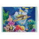 Zijderschilderij van een groene zee schildpad en vrienden. Kleine goudvissen, engelvissen en anderen delen het zee met kleurrijke zeewier en koralen. Fun en helder voor aquariums, cadeauwinkels, geschenken en kaarten.