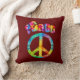 70's retro look gooi kussen beschikt over een groovy tie dye vrede teken met gebogen tekst op donkerrode achtergrond