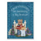 Diep blauwe kunstherenachtergrond met een beer jongen en een klein beer dat aan zijn voeten kruipt, voor een tuinpoort met bloemen. Een griezelig ontwerp perfect om een nieuwe grote broer te feliciteren met de geboorte van zijn kleine zus. Pas het aan door het vers te veranderen en/of uw persoonlijk bericht toe te voegen.