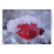 Eine schwarz gepunktete, rote Hagebutte mit Schnee ist auf dieser Wintergrusskarte zu sehen.
