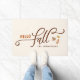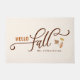 "Herfst" verliefd op deze moderne en elegante herfstdeurmat met typografie en eenvoudige kleurrijke bladeren. Personaliseer de sjabloon met uw familienaam of aangepaste tekst. Getoond in een neutraal kleurenpalet van sinaasappel, bruin, geel en bruin op een crème achtergrond, maar alle kleuren zijn bewerkbaar. © Kimbelished, LLC