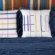Trendy marinekussen, sinaasappel, lila, paarsste HALLO en witte kussen met kleurrijke strepen aan beide zijden.