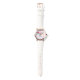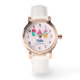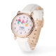 Een horloge met een illustratie van 3 verschillende ijsjes. Een blauwgroene ijslolly met aardbeiendruipen en kleurrijke strooisels. Een watermeloen ijslolly. Een kegel met lagen heerlijk ijs in roze en munt. Allemaal met schattige kawaii glimlachen.