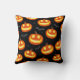 Cartoon Pumpkin Pattern Pillow. Dubbelzijdige Halloween kussen, voorzien van een patroon van lachende pompoenen. Eén zijde heeft een oranje achtergrond. De andere kant heeft een zwarte achtergrond.