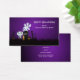 Een spooky leuke visitekaartje template met een halloween groet. Griezelig schattig halloween ontwerp. Gelegen op een donker en eng kerkhof. Op een grafsteen staat RIP, met een kaars en wat gloeiende schedels op de grond. Een oud krakkemikkig hek leunt naar de zijkant. Een schattig glimlachend skelet zwaait en een paar stoer ogende geesten draaien rond in de lucht. Stel dit in op een achtergrond met een zwart en een paars verloop.
