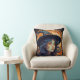 Schattigee heks met paarse haren op een oranje wervelende achtergrond.
