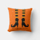 Halloween decor met grafische heksenschoenen en haar voorraad en "het is een spooky-seizoen" in het leuke lettertype. Aan de andere kant zijn zwarte en gele strepen met de familienaam 'werpt kussen'.