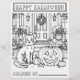 Halloween thema-activiteitspagina's voor kinderen, tieners of volwassenen. Een zwarte kat zit op een veranda met een pompoen. Mooi dik papier om kleuren gemakkelijk te maken.