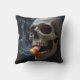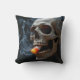 Een schedel houdt een stuk snoepmaïs in zijn tanden en ademt grillige wervelingen van rook uit
