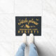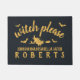 Klassieke en elegante Halloween doormat voor herfst met donkere faux burlap achtergrond in spooky dark grijy - "witch alsjeblieft" tekst in maar sinaasappel met vleermuizen, een vliegende heks en je familienaam