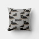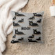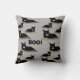 Een patroon van zwarte katten met gele ogen op een grijze achtergrond, met het woord "Boo" in het midden. Dit is de perfecte kussen voor Halloween.