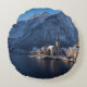 Ronde foto's gooien kussens met de stad Hallstatt bedekt met sneeuw aan de wand van het Hallstätter See meer met Alpen-bergen op de achtergrond in het eerste licht van de zonsopgang in een winterlandschap in Oostenrijk.