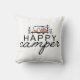 Een coole hand getekende illustratie voor avonturiers met een camper in het bos. De tekst luidt: Happy camper.
