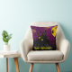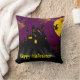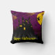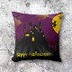 Halloween-modekussens met haunted castle, een heks die naar de maan vliegt en vleermuizen rond het kasteel met Happy Halloween aanpasbare tekst onderaan. De achterkant is zwart.