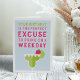 Perfect voor je gelukkige uurtje vriend, op deze grappige verjaardagskaart staat: "Jouw verjaardag is het perfecte excuus om op een weekdag te drinken" in kleurrijk schrijven met een fruitige groene margarita cocktail illustratie. Pas je aan met je eigen voorgedrukte binnenbericht of laat de voorbeeldtekst achter (getoond met "kauwen naar je — gelukkige verjaardag").