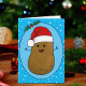 Vrolijke kerstaardappel met een rode kersthoed met een witte bontstrip en een witte pompoen. Zijn lichaam is bruin met kleine zwarte stippen voor ogen en een grote vrolijke glimlach. Hij heeft wapenstokken en houdt groene holly bladeren met rode bessen. Achter hem zit een blauwe achtergrond met witte sneeuwvlokken. Onder de aardappel zit een zwarte sjabloon voor je om je eigen tekst toe te voegen om deze kerstversiering te personaliseren.