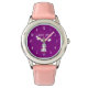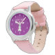 Een horloge met een schattige illustratie van een witte eenhoorn die op zijn rommel zit te glimlachen en er gelukkig uitziet. Het glimlachen van wolken en een regenboogoverhead. Er staat: Happy Vibes. Schattig opvijzelend afbeelding. Plaats op een roze paarse achtergrond van de waterverf.