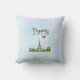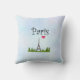 Een kussen met een grillige tekening van de Eiffeltoren op de achtergrond omringd door groene bomen. Een roze hart en een Parijse typografie voegen een meisjesachtige flair toe.