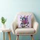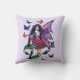 Schattige fee helemaal in paars en rood met geruite kousen zittend op een paddestoel met vlinders er omheen.