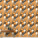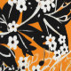 Een naadloos patroon met grote witte bloemen, kleine witte bloemen, zwarte bladeren en kleine zwarte muzieknoten op een oranje achtergrond. Het ontwerp heeft een handgeschilderde uitstraling, waarbij bloemelementen met muzikale motieven worden gecombineerd tot een harmonieuze en artistieke creëer.