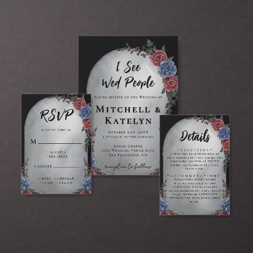 Bring the supernatural to your wedding night with this frightful "I See Wed People" table number. With it's headstone and moody blue and red floral arrangements, it's the perfect stationary to prepare for a haunted Halloween wedding extravaganza. Perfect for couples who plan to tie the knot in the spooky season or for anyone who loves a gothic twist.