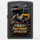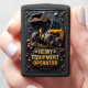 This dynamic design is a unique tribute to the heavy equipment operator who masters the compact power of the skid steer loader. The central image features a robust, yellow skid steer on heavy-duty tires, with its massive bucket raised high, pouring a shower of gravel, dirt, and debris. This dynamic action highlights the machine's essential versatility and efficiency in tight spaces for digging, grading, and material moving on any job site. The entire scene is set against a dark, textured background and framed by an ornate, dark industrial emblem detailed with bronze accents and star motifs, lending the piece a powerful and professional aesthetic. This design celebrates the operator's dexterity, precision, and vital role in handling materials where larger machines cannot go. The bold, golden text "HEAVY EQUIPMENT OPERATOR" is clearly displayed, making this lighter an excellent, unique gift that honors the skilled professional who commands this indispensable piece of equipment.