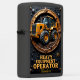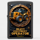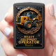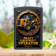 This dark, rugged, and imposing design is a powerful tribute to the heavy equipment operator who commands the immense lifting and moving capacity of the wheel loader. The central image features a prominent, yellow and black wheel loader on massive, heavy-duty tires, actively positioned on a mound of dark earth. The machine is contained within a large circular gear-like frame detailed with bronze metallic and rugged textures, which emphasizes the loader's powerful, mechanical control and essential function in material handling on the job site. The surrounding panel features a dark, heavily textured background detailed with bronze scrollwork, rivets, and decorative starbursts, lending the piece a commanding and prestigious aesthetic. This design celebrates the operator's skill, precision, and vital role in all site preparation and groundwork. The bold, golden text "HEAVY EQUIPMENT OPERATOR" is prominently displayed, honoring the professional who directs the essential movement of materials and operates this powerful machine.