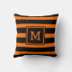 Moderne, heldere zwarte en oranje streep, monogrammed kussen-brede zwarte en oranje strepen achtergrond. Centered is een oranje monogram initiaal in een modern lettertype dat in een zwart en oranje vierkant is omhuld. Hetzelfde aan beide zijden. Modern, helder decor. Uniek Halloween decor. Fun, monogrammed-cadeau voor huisverwarming of dorm decor-cadeau. U kunt deze zwarte en oranje kussen in verschillende maten en doekopties krijgen voor een modern zwart en oranje decor of een monogrammed slaapkamerdecor accent.