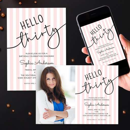 Hello Thirty Modern Script Chic Stripes BirthdayConçu par Linda Terwee