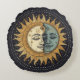 Hemelse mystieke ronde zon maan gezicht kussen. Goudblauwe en zwarte tinten. Weelderige beschilderde tinten. Voeg een vleugje mystiek toe aan uw interieur.