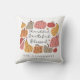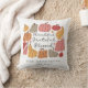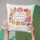 Een schattig kussen met pompoenen en de uitdrukking "Dankbaar Gelukkig Gezegend" - gepersonaliseerd met een familienaam en vastgestelde datum.
