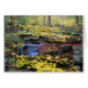 Heldere gele herfstbladeren laten de grond naast een snel stromende boer in het bos vallen.