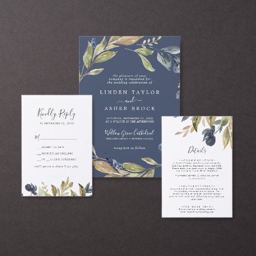 Dit najaar groen marine bedankje is perfect voor een herfst bruiloft. Het moderne rustieke ontwerp heeft marineblauw, salie groen en gouden bladeren met takjes donkerblauwe bloemen. Personaliseer de binnenkant van de kaart met uw namen en een bedankbericht. U kunt ook de sectie sjabloon bedankbericht leeg laten om met de hand een doordachte persoonlijke notitie op elke kaart te schrijven nadat ze zijn aangekomen. Deze kaarten kunnen worden gebruikt voor een bruiloft, vrijgezellenfeest of een speciale gebeurtenis.