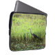 Een foto van een Grote Blauwe Reiger die door een vijver loopt. Het oppervlak van de vijver is bedekt met waterlelies. De vijver is omringd door stengels van groene planten, die grenzen aan een weide. Fotorechten ©2021 Kimberly J Tilley.