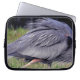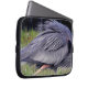 De grote blauwe reiger, op de originele foto van MaeFlowers op deze 10-inch laptophoes, trekt zijn veren op terwijl hij op een andere reiger afloopt, een indringer in zijn territorium. De foto is een close-up van het lichaam van de wilde vogel in profiel, en toont het lange, dunne verenkleed aan de bovenkant, en de bredere vleugelveren eronder. Het lichaam van de reiger is een zachte blauwachtige grijze kleur, waarbij het blauw uitkomt in het zonlicht. Er zijn zwarte veren op de bocht van de vleugel, met een vleugje roodbruin en wit. De achtergrond is wild gras aan de rand van het water, met een gegolfde reflectie op het water.