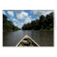 Een boot negeert langs een rivier in het Amazonegebied onder puffe wolken in een blauwe hemel.